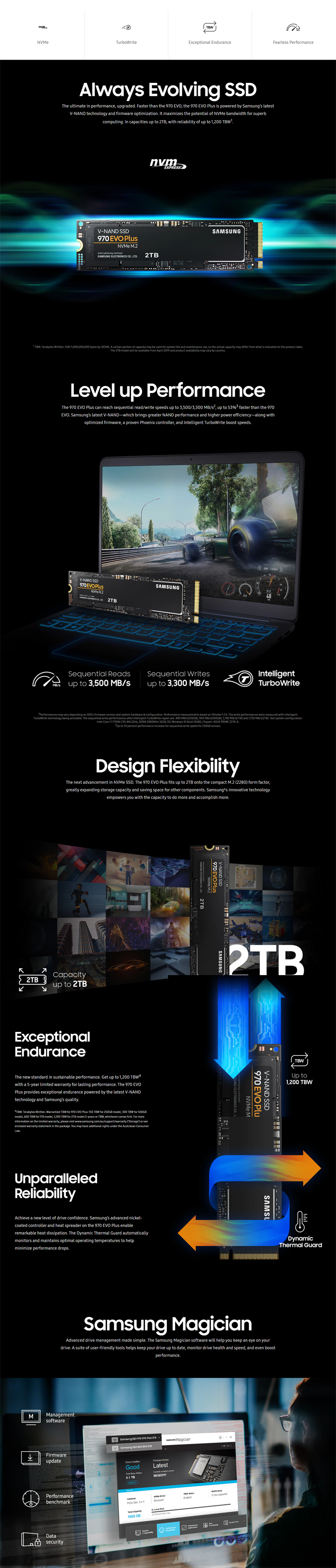 The ultimate in performance, upgraded. Faster than the 970 EVO, the 970 EVO Plus is powered by the latest V-NAND technology and firmware optimization. It maximizes the potential of NVMe bandwidth for unbeatable computing. In capacities up to 2TB, with reliability of up to 1,200 TBW.