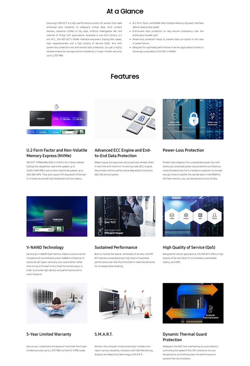 The Samsung SSD 983 DCT M.2 presents outstanding performance with instant responsiveness to the host system, by applying the Peripheral Component Interconnect Express (PCIe) 3.0 interface standard, as well as highly efficient Non-Volatile Memory Express (NVMe) Protocol.The Samsung SSD 983 DCT M.2 delivers wide bandwidth of up to 3,000MB/s for sequential read speed and up to 1,400MB/s for sequential write speed under up to 8.0 W power. With the help of Toggle 3.0 NAND Flash interface, the Samsung SSD 983 DCT M.2 delivers random performance of up to 480K IOPS for random 4 KB read and up to 42K IOPS for random 128 KB write in the sustained state.