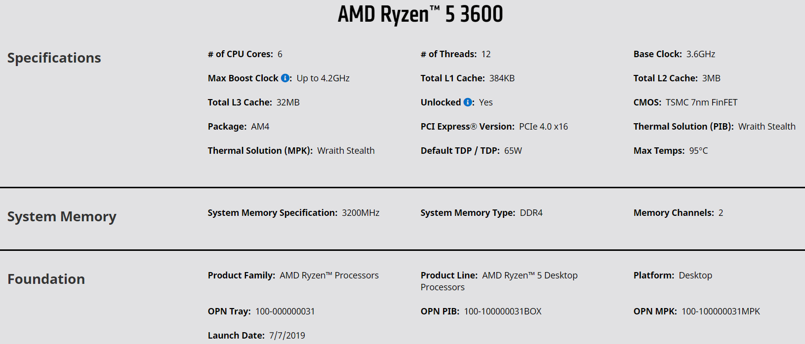 Amd Ryzen 5 3600 6-Core/ 12 Threads Unlocked Max Freq 4.20Ghz 36Mb Cache Socket Am4 65W With Wraith Stealth Cooler 100-100000031Box