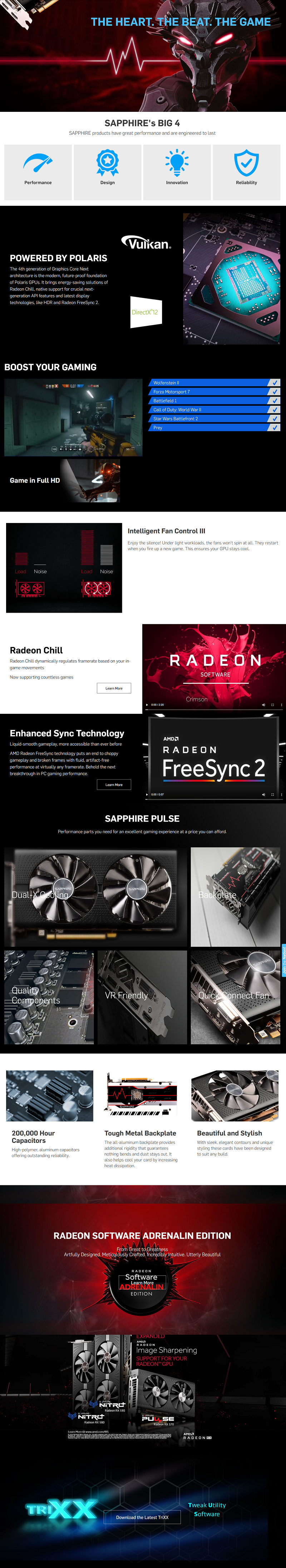 Sapphire AMD Radeon RX 580 PULSE OC Lite, 8GB GDDR5, 2*HDMI/2*DP, DirectX 12, PCI Express 3.0, Boost Clock: 1350MHz, 8Pin Power (11265-67-20G)