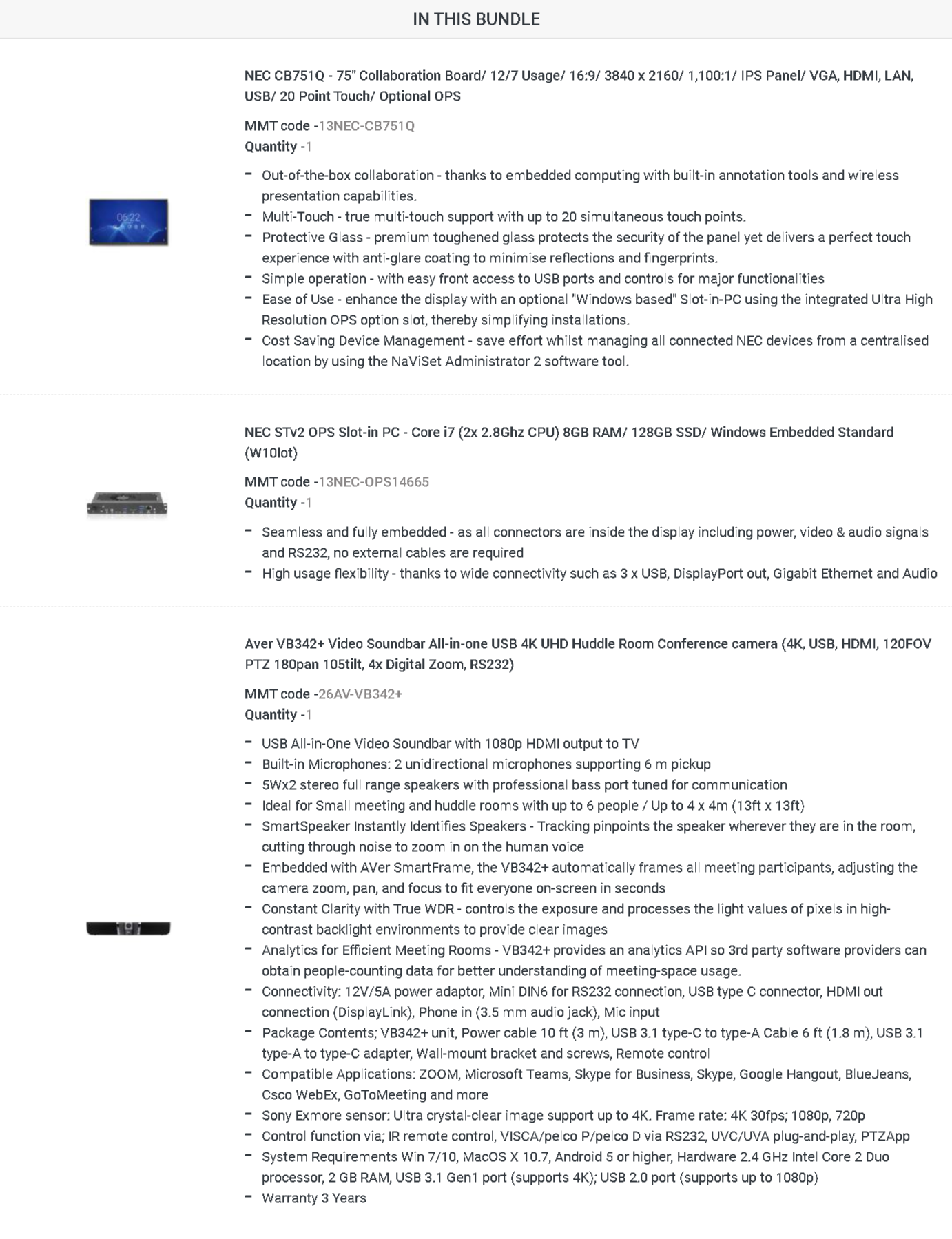 Nec 75" Collaboration Board Video Conference Bundle W/ I7 Ops Slot-In Pc With Windows Aver Vb342+ Video Soundbar Usb 4K Uhd Conference Camera Cb751Q + 14665 + Vb342+