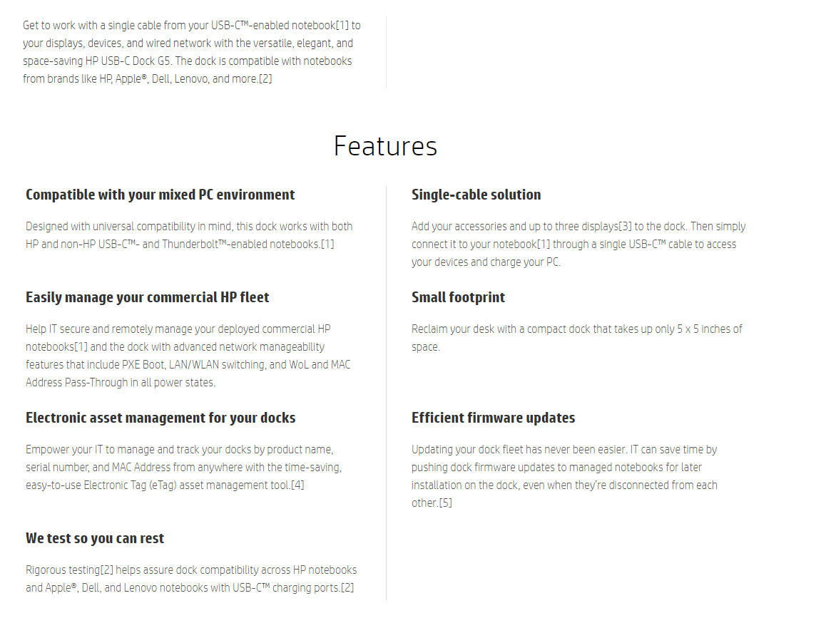Get to work with a single cable from your USB-C-enabled notebook to your displays, devices, and wired network with the versatile, elegant, and space-saving HP USB-C Dock G5. The dock is compatible with HP notebooks, MacBook computers, and other notebooks.