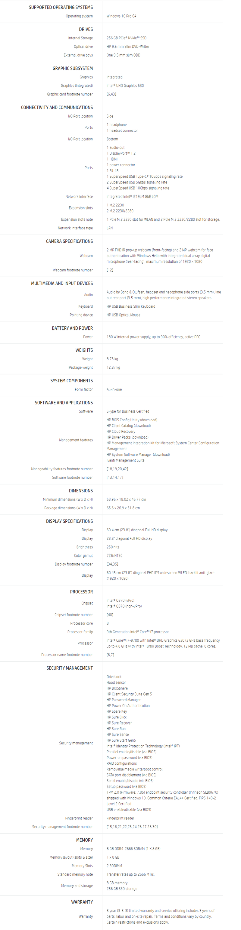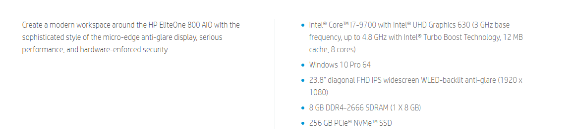 Hp Eliteone 800 G5 Aio -7Nx91Pa- Intel I7-9700 Vpro/ 8Gb/ 256Gb Ssd/ 23.8" Fhd Non Touch/ Dvd/ Webcam Ir With Windows Hello/ W10P/ 3-3-3 7Nx91Pa