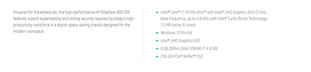 ⚫Intel Core i7-9700 vPro with Intel UHD Graphics 630 (3 GHz base frequency, up to 4.8 GHz with Intel Turbo Boost Technology, 12 MB cache, 8 cores)