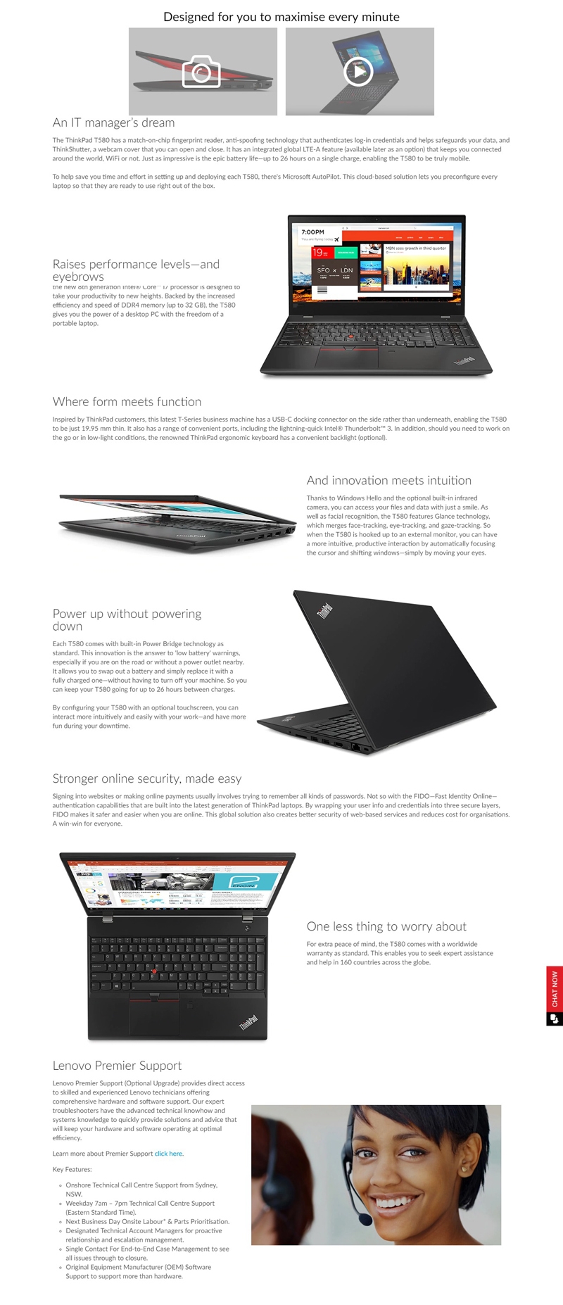 | Marketing Text | This is a bundle sku and components are: * Lenovo T580 15.6 Inch I5-8250U 8G 256G W10P 3 Year * Lenovo T24M-10 23.8 FHD HTADJ (DP+HDMI+USB-C) 3 Year Produce to your true potential with the powerful ThinkPad T580. Its vivid 15-in display lets you see everything and still be agile. Productivity-rich features include a 27-hour battery life, plenty of ports, and convenient side docking. Whats more, with enhanced security built in, you have peace of mind wherever your work takes you. |