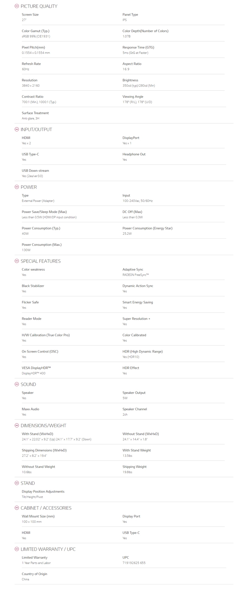 Lg Ul850 27" Uhd Ips Led (16:9) 3840X2160 5Ms Hdmi Dp Usb-C Hdr400 Tilt 3Yr 27Ul850-W
