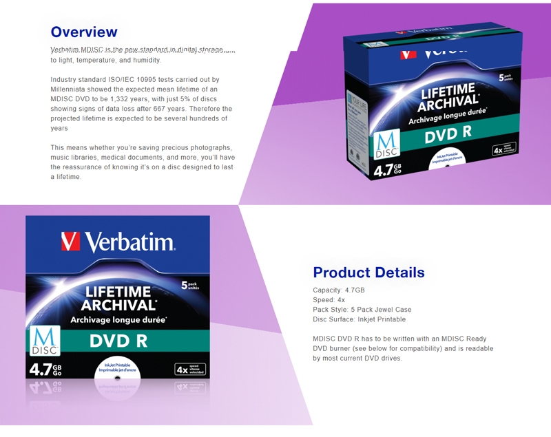 | Marketing Text | Verbatim MDISC is the new standard in digital storage designed to preserve and protect your files by engraving your information into a patented "rock-like" layer, resistant to light, temperature, and humidity. |