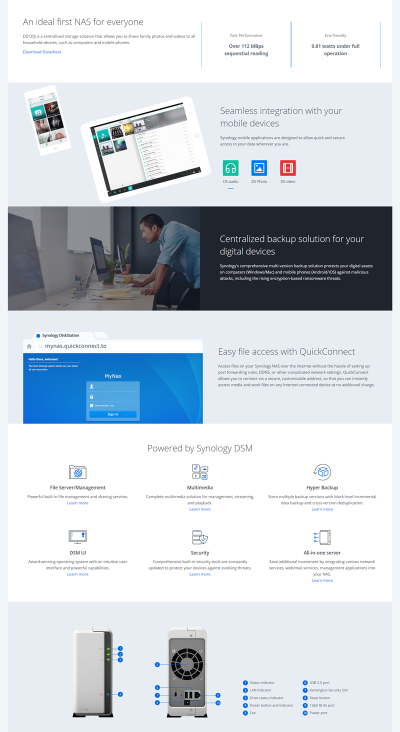 Synology DiskStation DS120j is a budget-friendly and easy-to-use 1-bay NAS for storing, sharing and protecting personal data. DS120j offers a variety of applications, allowing beginners to explore the convenient functionality of a Synology NAS. DS120j is backed by Synology's 2-year limited warranty
