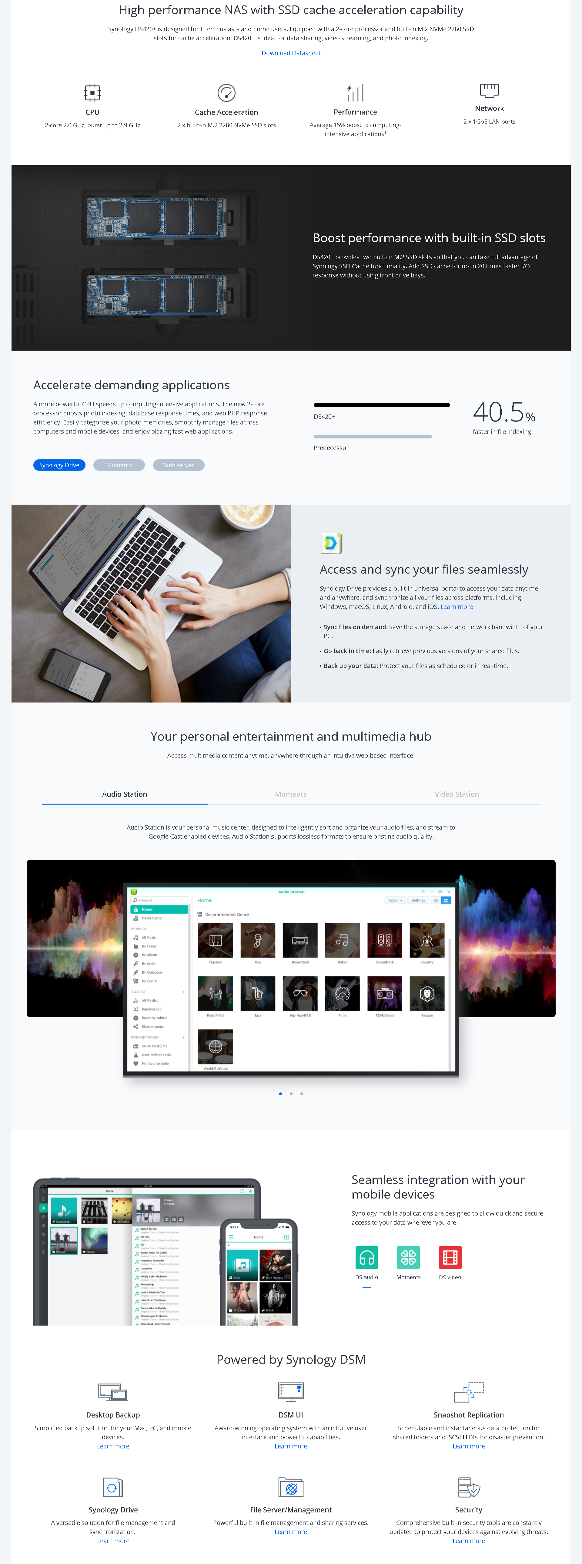 Synology DiskStation DS420+ is a networkattached storage solution for smooth data sharing, video streaming, and photo indexing. Two built-in M.2 SSD slots and Synology SSD Cache technology allow you to boost system I/O and application performance.Warranty can be extended to 5yrs with the purchase of EW201!