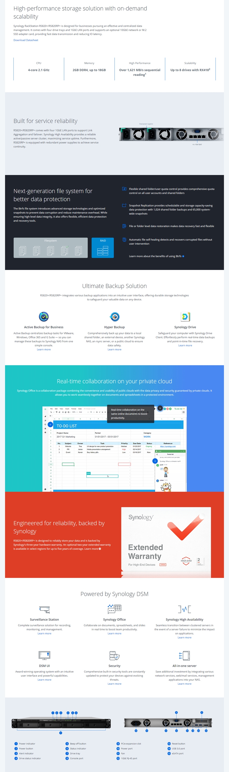 Synology RackStation RS820+ is an ideal network-attached storage solution for centralizing data management. Powered by a 4-core processor, RS820+ provides both high performance and scalable storage, ideal for file sharing across different platforms and data backup.Synology RS820+/RS820RP+ is backed by Synology's 3-year limited warranty