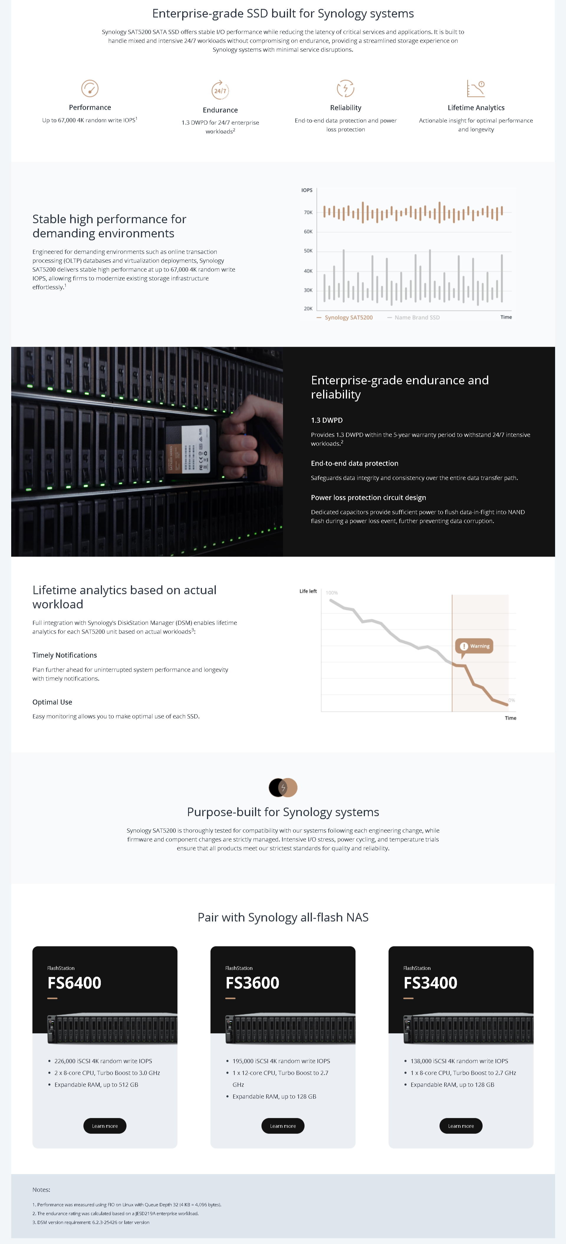 Synology SAT5200 offers stable I/O performance while reducing the latency of critical services and applications. It is built to handle mixed and intensive I/O workloads without compromising on endurance, providing a streamlined storage experience on Synology systems and minimizing service disruption. The SAT5200 series comes with advanced lifetime analytics and is backed bySynology 5-year limited warranty.