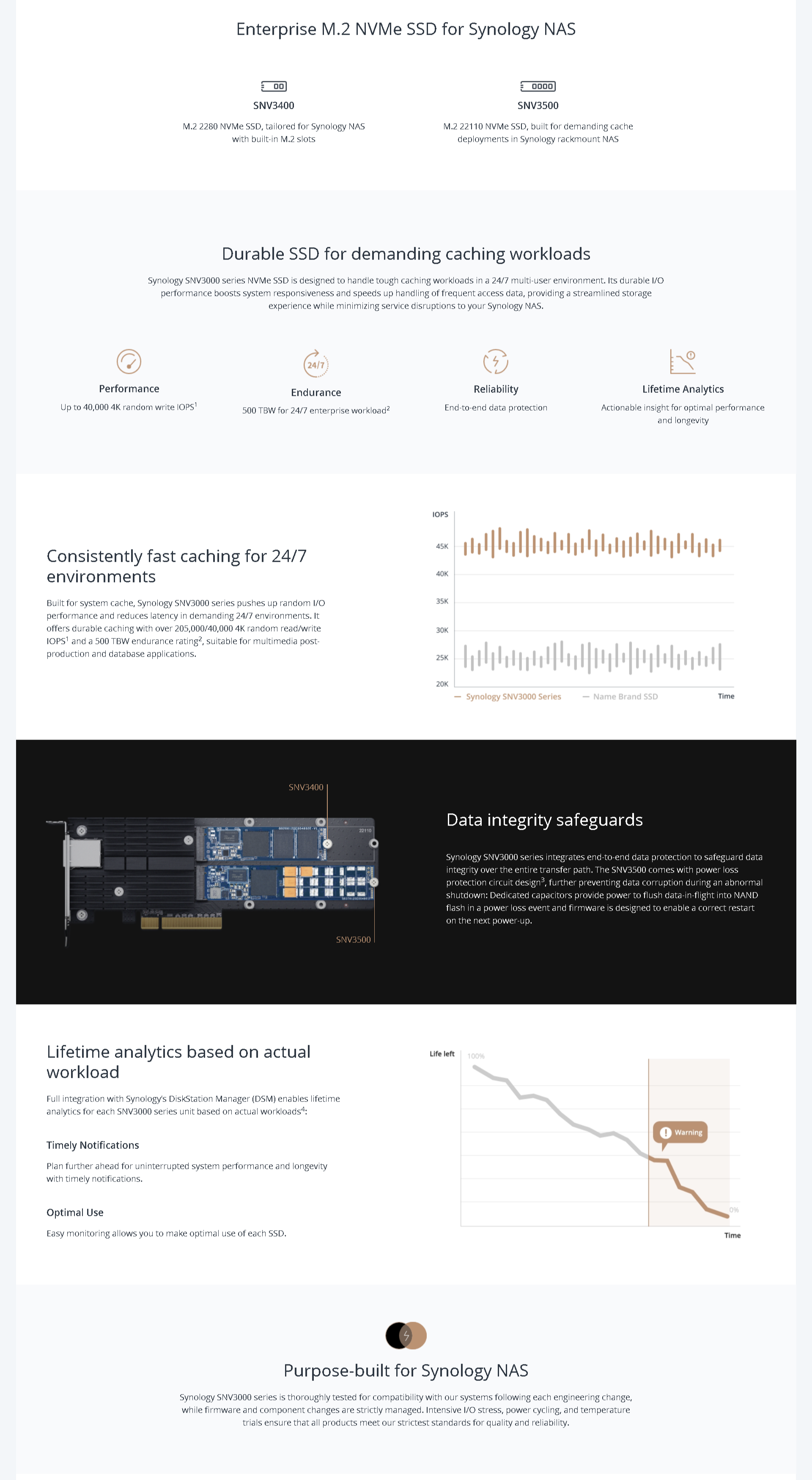 Synology SNV3000 series is designed to handle tough caching workloads in a 24/7 multi-user environment. Its durable I/O performance boosts system responsiveness and speeds up handling of frequent access data. Purpose-built for Synology systems, the NVMe solid-state drive line provides a streamlined storage experience while minimizing service disruptions. The SNV3000 series comes with advanced ifetime analytics and is backed by Synology 5-year limited warranty.