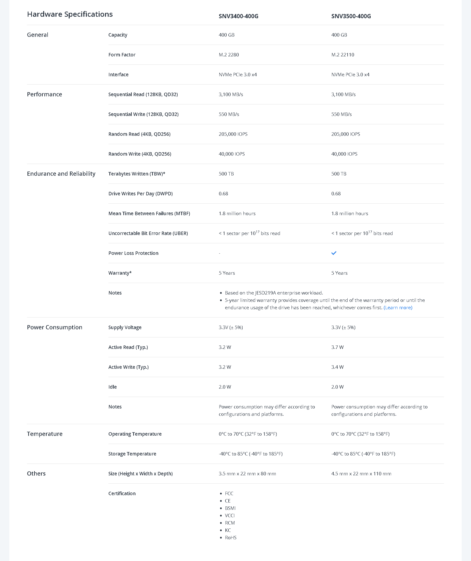 Synology SNV3000 - M.2 NVMe SSD - 5 year Limited Warranty - Form factor - M.2 2280 - 400GB Check Compatible models Snv3400-400G