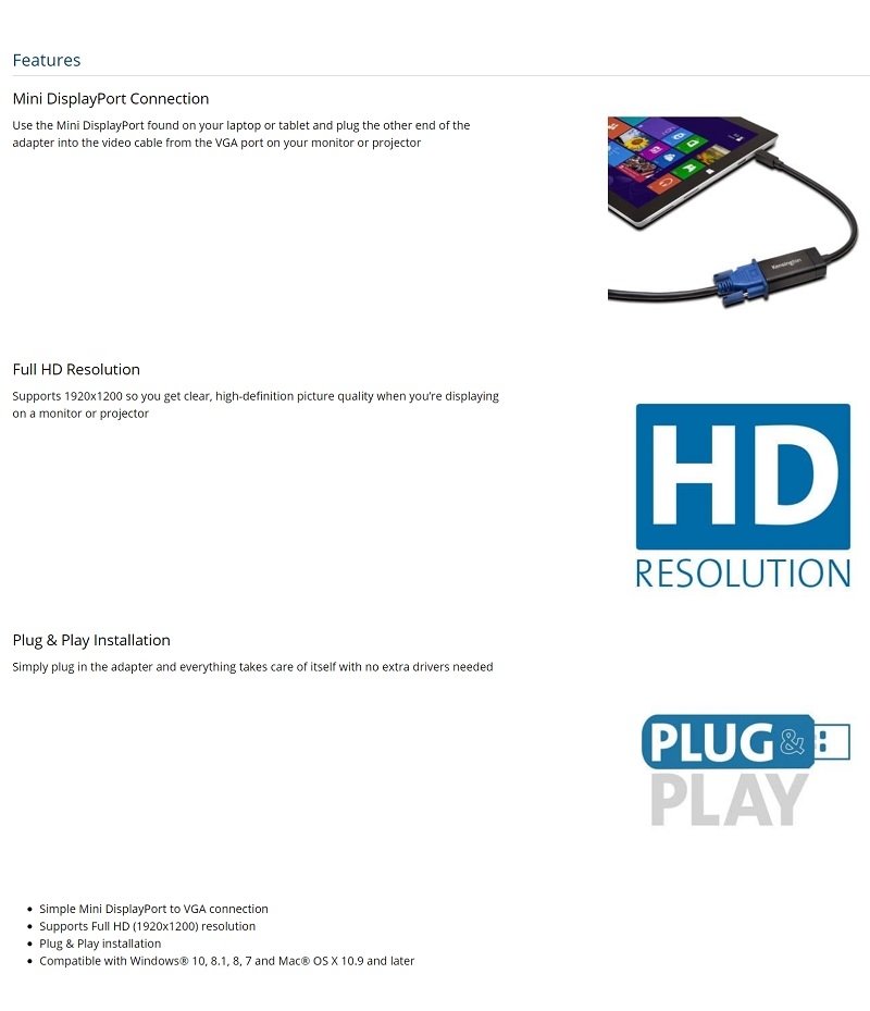 | Marketing Content | When you need to put what's on your laptop screen on a monitor or a projector, there's no easier way than with the VM1000 Video Adapter. It plugs into Mini DisplayPort commonly found on laptops and then runs to the VGA port on a monitor or projector. The adapter supports full HD resolution so you get a crystal clear picture and offers Plug & Play installation so you're up and running in no time. |