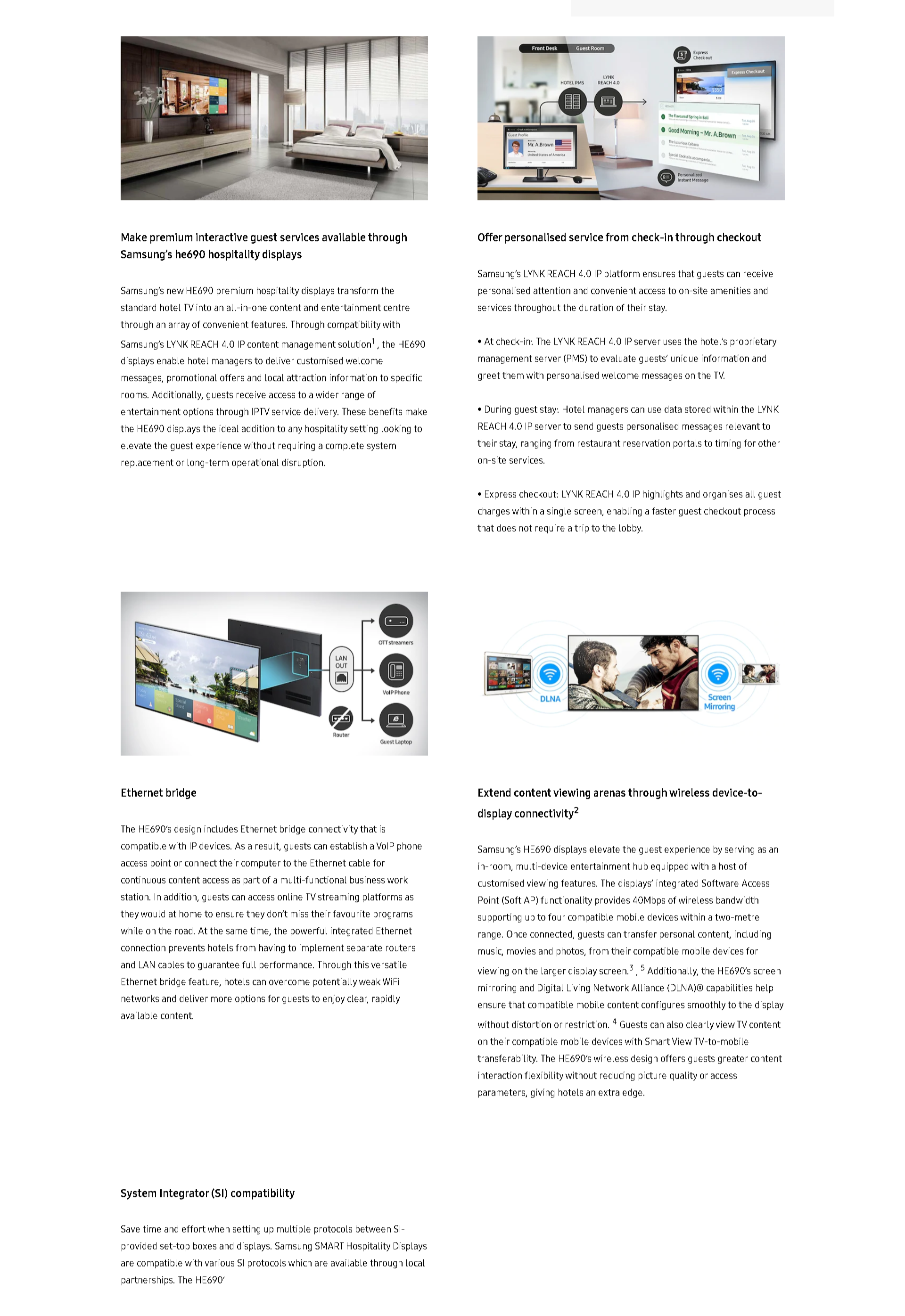 | Marketing Text | Samsung's new HE690 premium hospitality displays transform the standard hotel TV into an all-in-one content and entertainment centre through an array of convenient features. |
