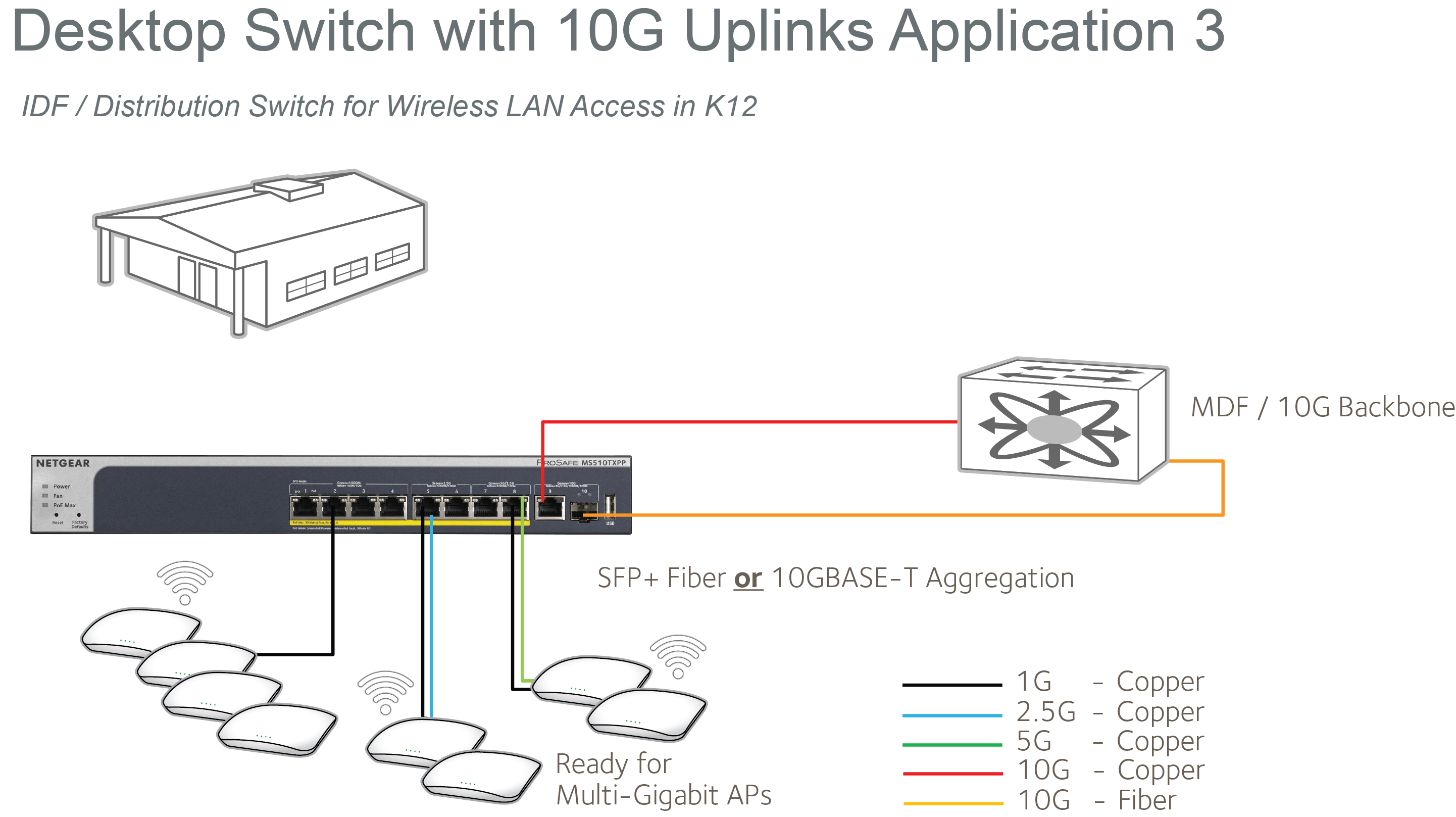 You can now have your PCs, printers and routers/firewalls connected at 1G and aggregate Multi-Gigabit Ethernet new devices on the same switch, all line-rate. 10G copper and fiber ports are ready for local servers and storage, or high-speed aggregation to your network core.