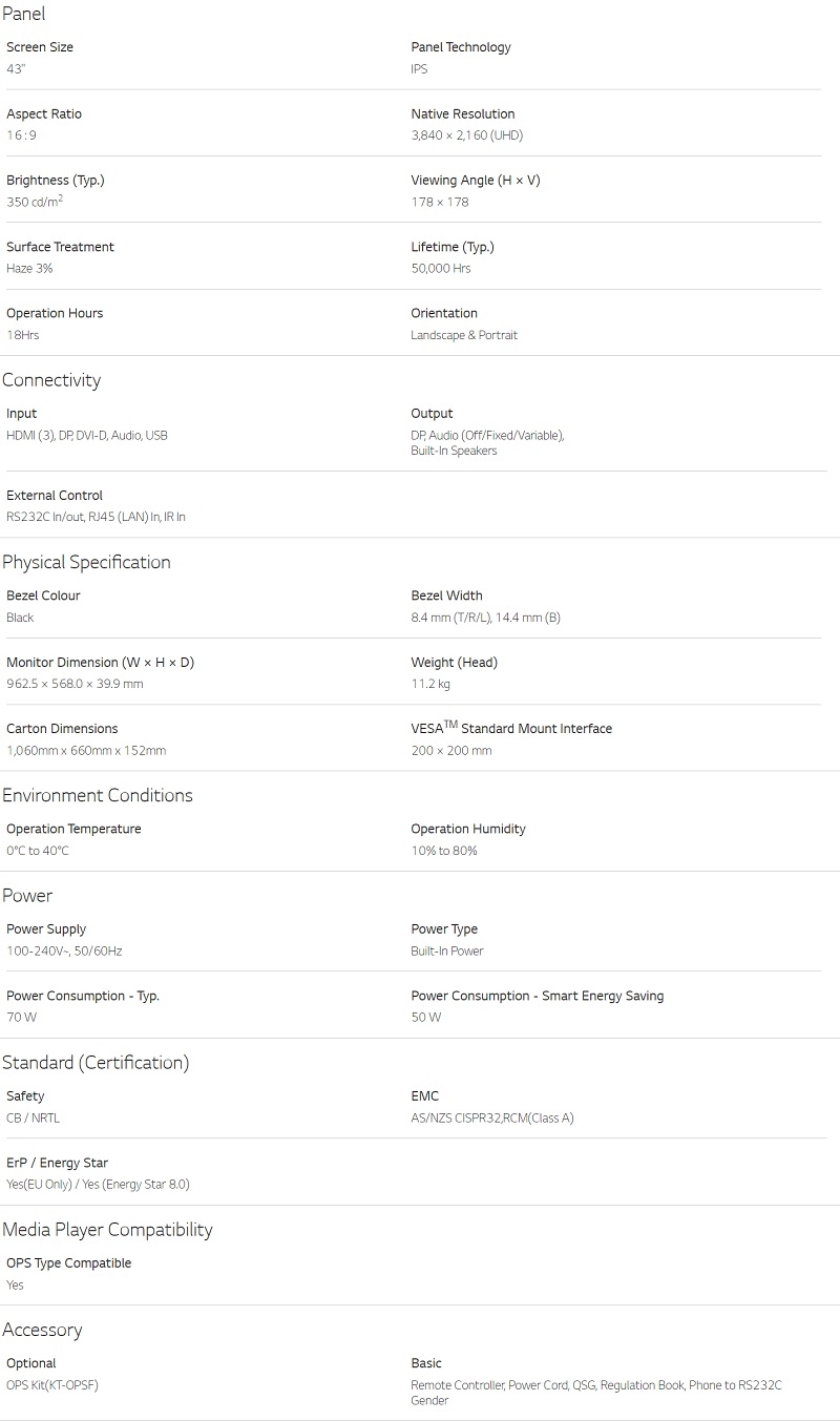 Led 350Nits Dvi Hdmi(3) Dp Spkr Web O/ S 18/ 7 3Y 43Um3Df-B