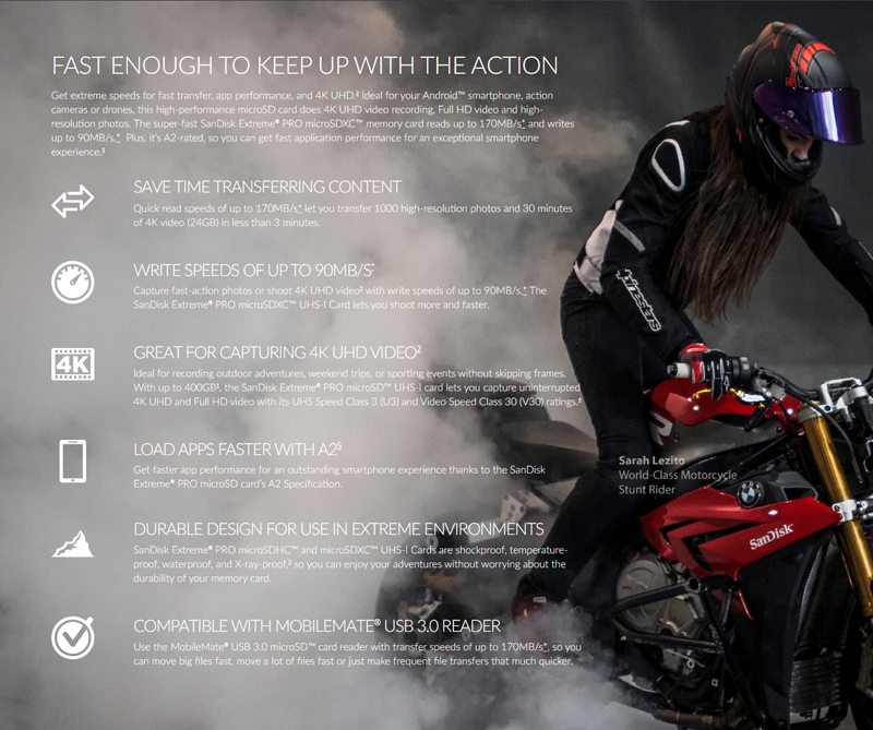 | Marketing Text | SanDisk Extreme PRO microSD UHS-I cards transform the way you experience your mobile device with read speeds of up to 100MB/s for advanced photo capture and faster file transfer. |