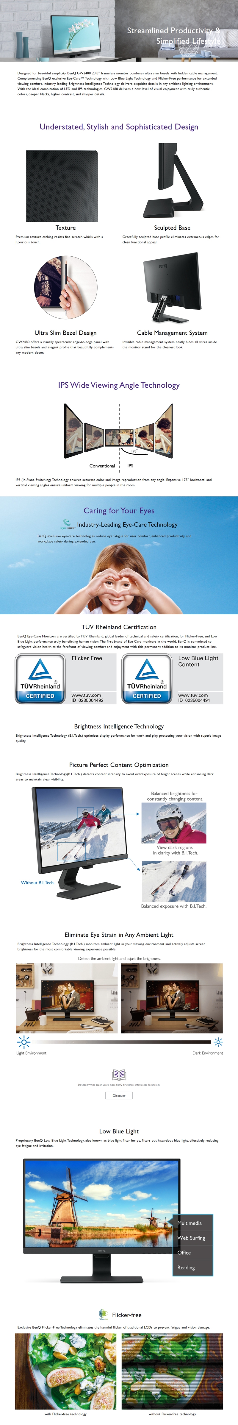 | Marketing Text | Designed for beautiful simplicity, BenQ GW2480 23.8 inch frameless monitor combines ultra slim bezels with hidden cable management. Complementing BenQ exclusive Eye-Care Technology with Low Blue Light Technology and Flicker-Free performance for extended viewing comfort. |