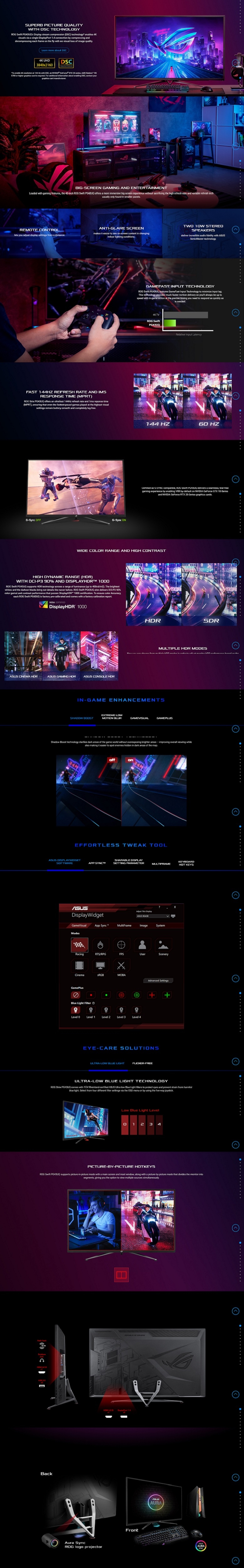 BIG-SCREEN GAMING AND ENTERTAINMENT Loaded with gaming features, the 43-inch ROG Swift PG43UQ offers a more immersive big-screen experience without sacrificing the high refresh rate and variable refresh tech usually only found in smaller panels.