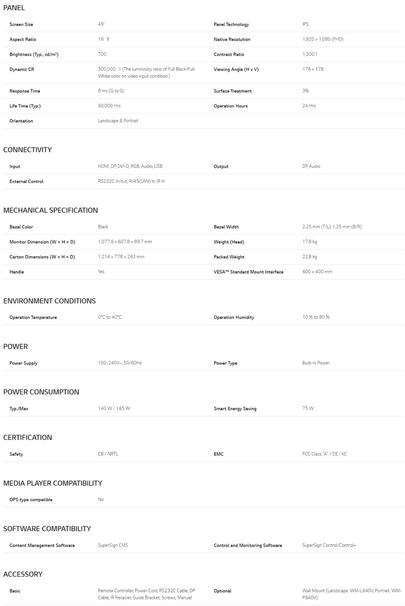 Lg Video Wall (Vl7D) 49" Fhd Led (49Vl7F-A)