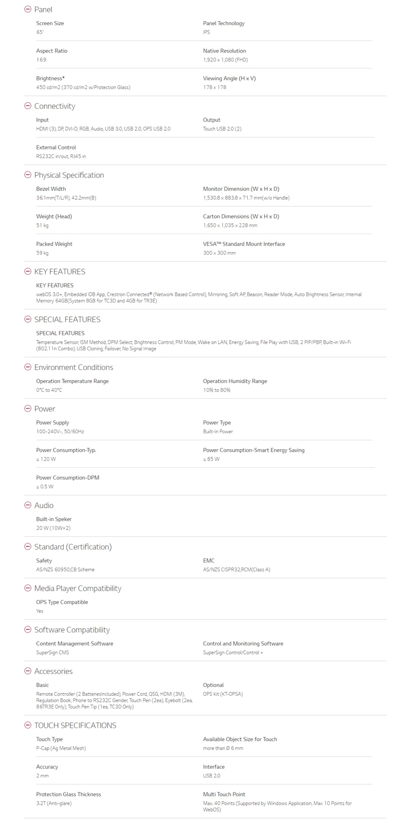 Lg Tc3D 65" 16:9 Fhd Led 1920X1080 10Ms Dsub Dvi Dp Hdmi Serial Lan Vesa 3Yr 65Tc3D-B
