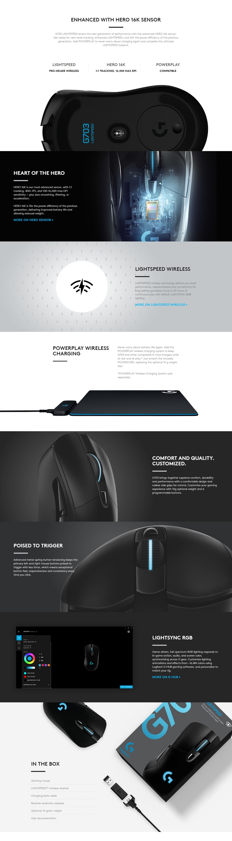 Logitech G703 Hero Lightspeed Wireless Gaming Mouse 16K Sensor- 2Yr Wty - Powerless Chargi 910-005642