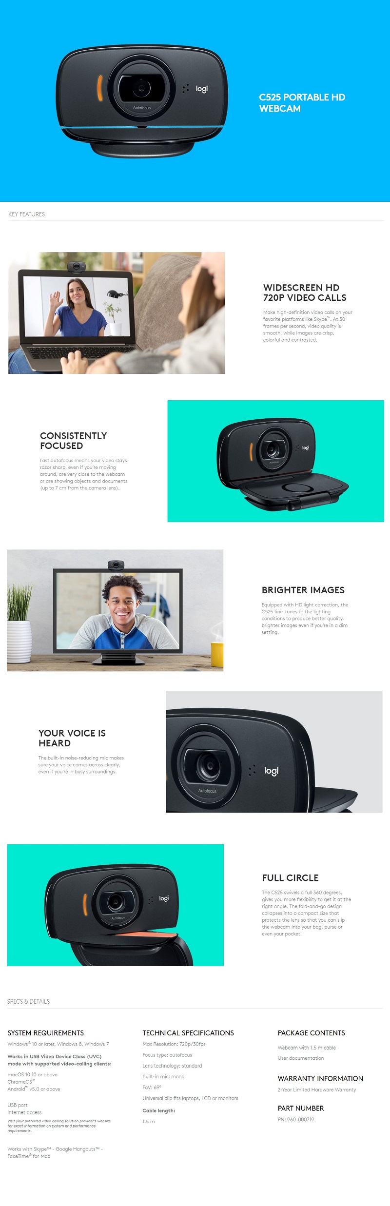 Webcam: C525, Portable HD Webcam 720P USB