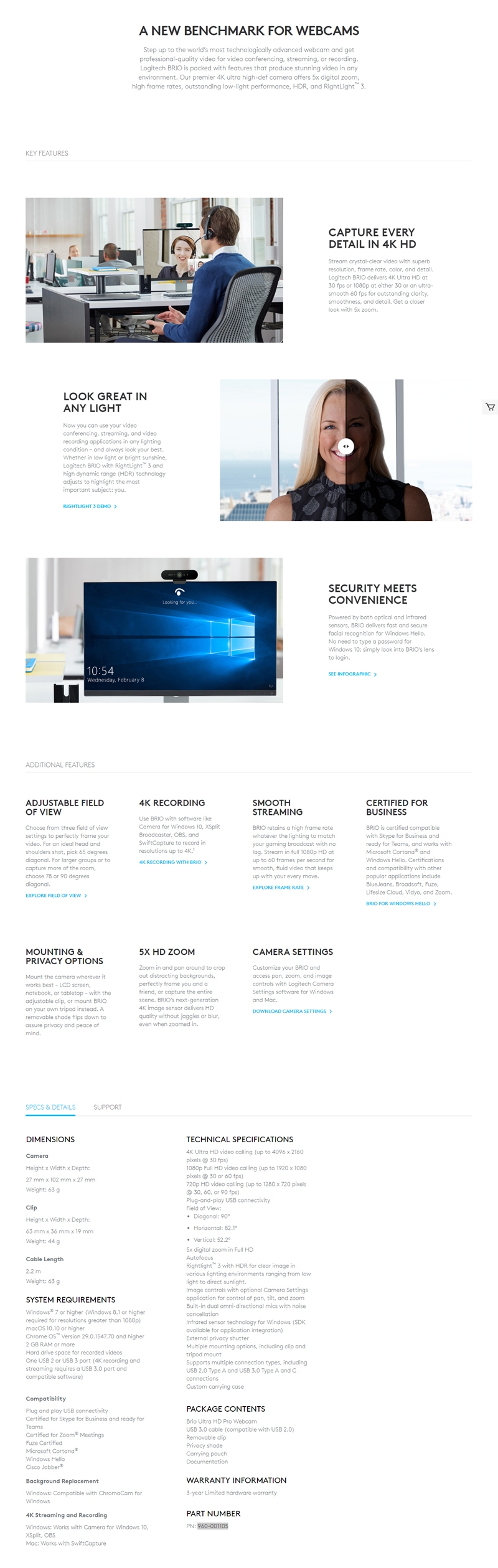 Step up to the worldâs most technologically advanced webcam and get professional-quality video for conference calls, streaming, or video recording. Logitech BRIO is packed with features that produce stunning video in any environment. Our first 4K ultra high-def camera offers 5x digital zoom and RightLight⢠3 with HDR. Background replacement gives you the freedom to meet anywhere.