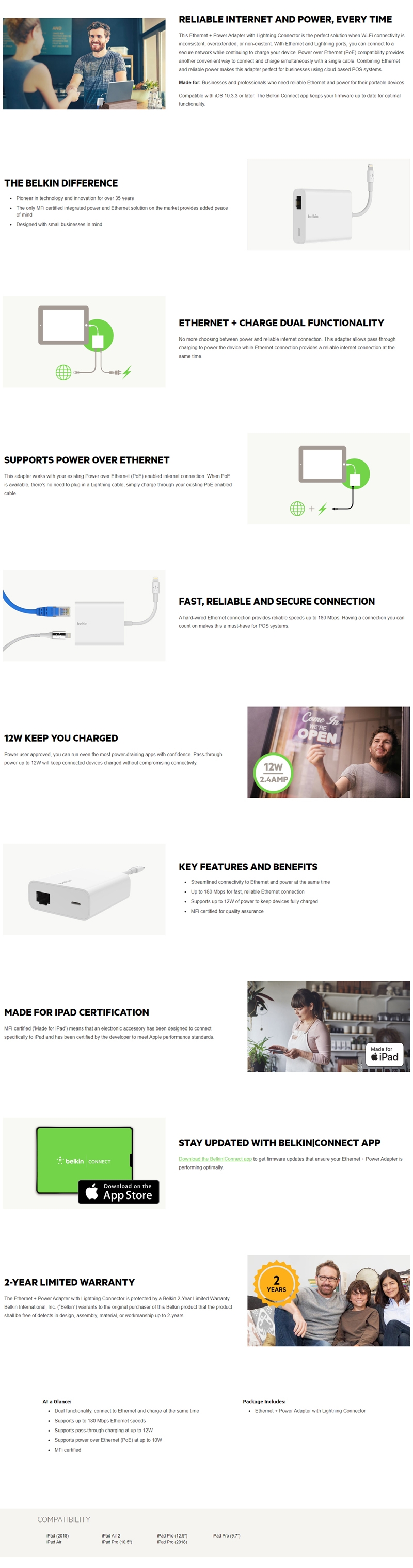 | Product Description | Belkin Ethernet + Power Adapter with Lightning Connector - network adapter - B2B |