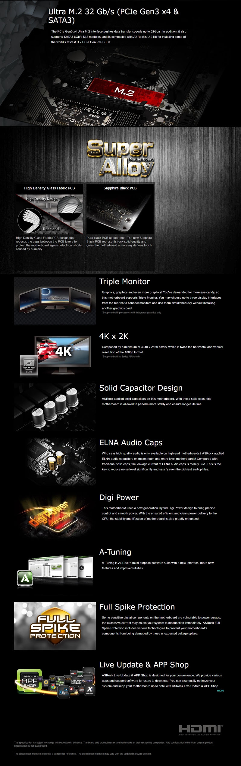 The PCIe Gen3 x4 Ultra M.2 interface pushes data transfer speeds up to 32Gb/s. In addition, it also supports SATA3 6Gb/s M.2 modules, and is compatible with ASRockâs U.2 Kit for installing some of the worldâs fastest U.2 PCIe Gen3 x4 SSDs.