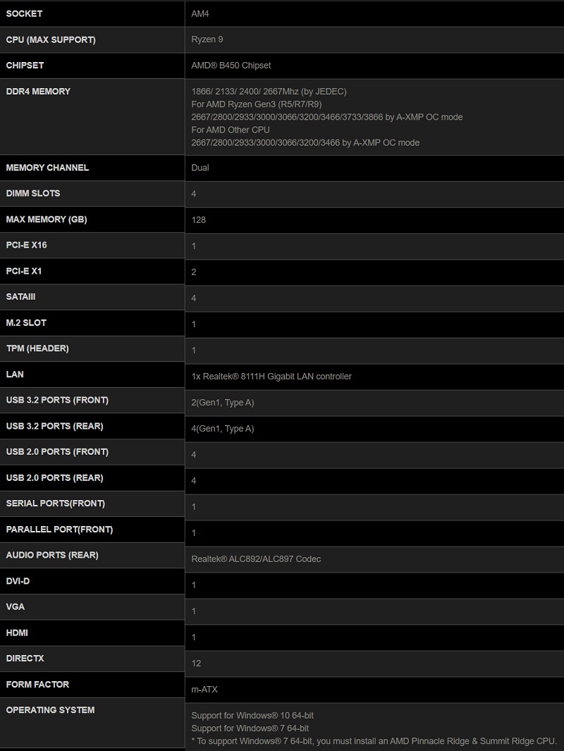 Micro-ATX Motherboard: B450 Socket AM4 For AMD Ryzen Processors4x DDR4, 4x SATA 6Gb/s, M.2, USB 3.2, Gigabit LAN, VGA/DVI-D/HDMI, RAID