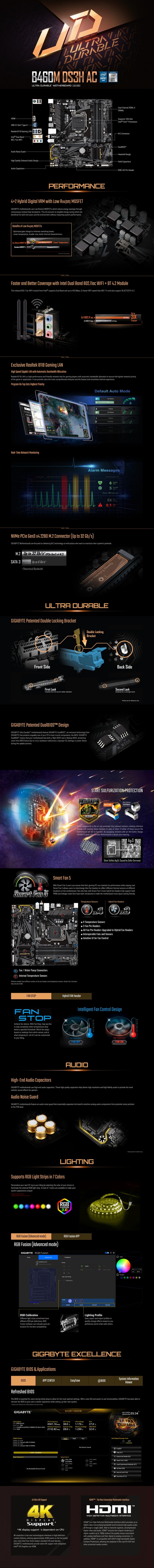 Gigabyte B460M DS3H AC B460 WiFi Micro-ATX MB : Socket 1200 For Intel 10th Gen. Processors 4 x DDR4, HDMI, 802.11ac WIFI & BT 4.2, Realtek HD Audio, 1 x PCIE x16, 2 x PCIE x1, 1 x M.2, 6 x SATA 6GB/s, 6 x USB 3.2 Gen 1, 2 x USB 2.0, RAID (B460M DS3H AC)