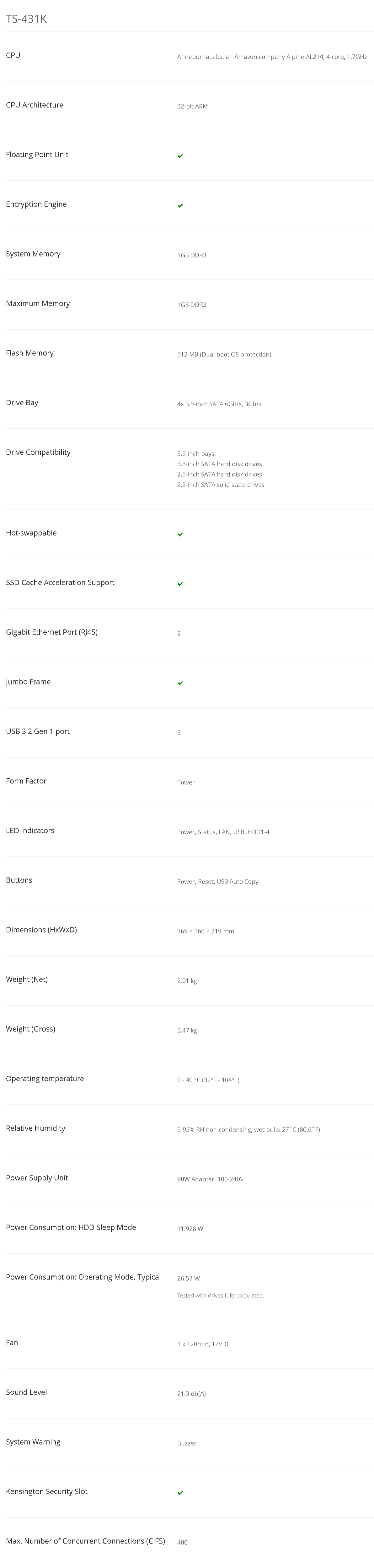 Powered by quad-core 1.7 GHz processor, the TS-431K provides 4 drive bays