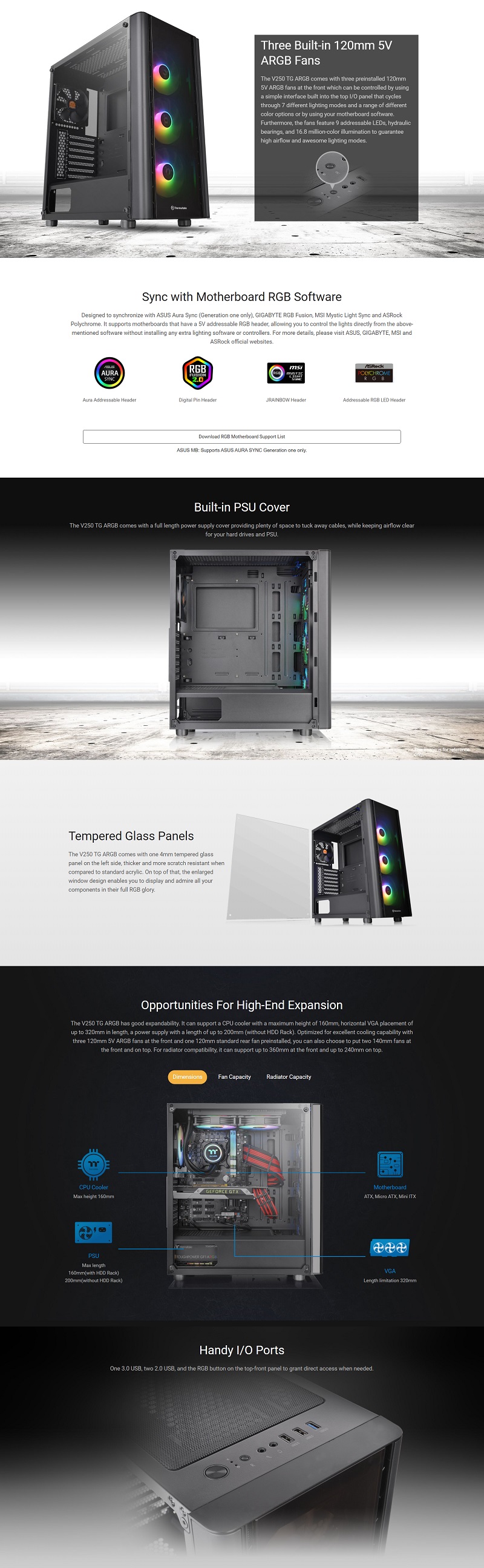 Mid Tower Case : V250 TG ARGB Tempered Glass, 3x ARGB 120mm Fan, 1x 120mm Fan, 1x USB 3.0, 2x USB 2.0, Support ATX/Micro-ATX/Mini-ITX