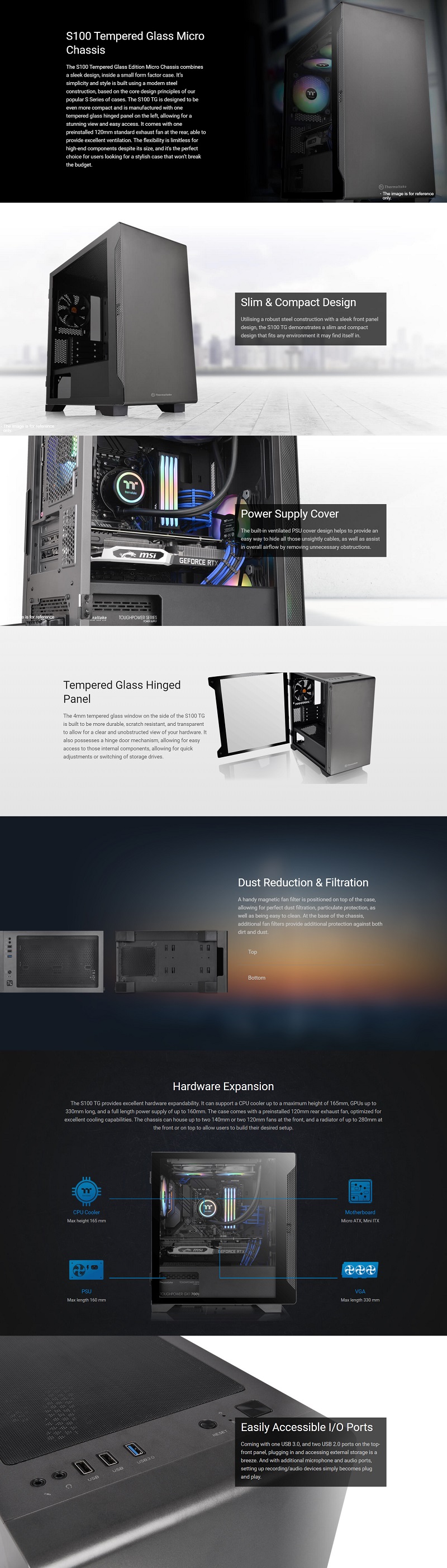 Thermaltake Mini-Tower Case:S100 Tempered Glass Black 1x 120mm Fan, 1x USB 3.0, 2x USB 2.0, Supports: mATX/mini-ITX (CA-1Q9-00S1WN-00)