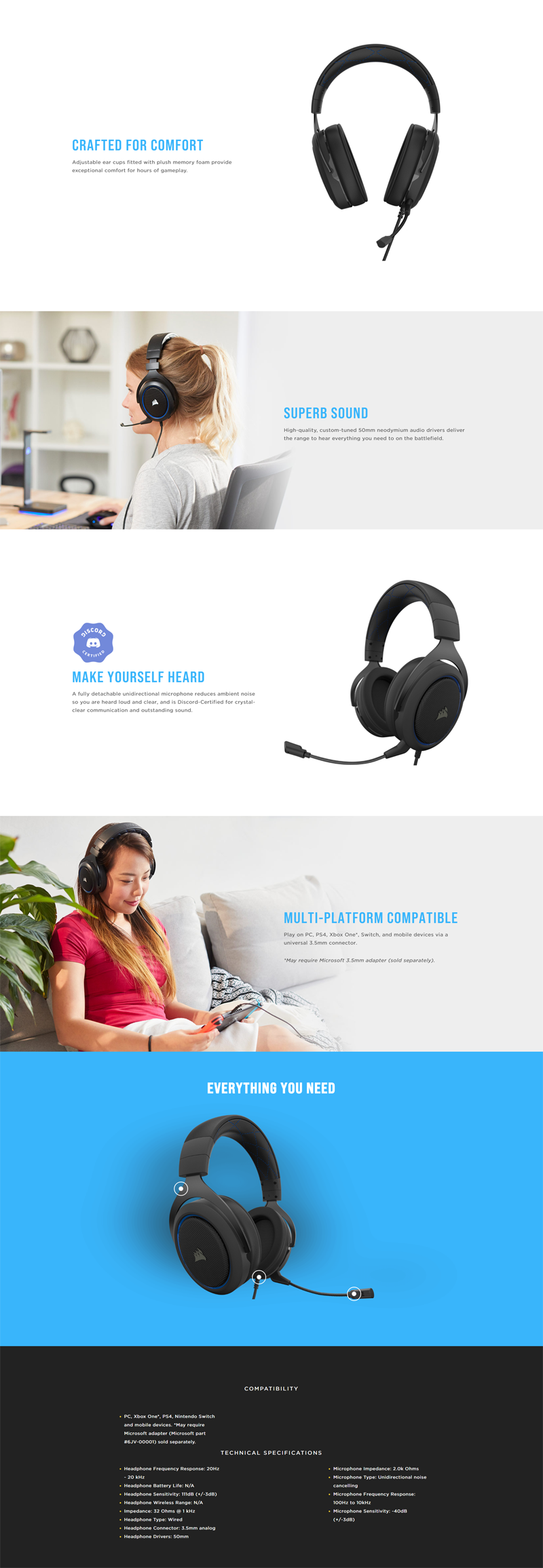 CORSAIR HS50 PRO STEREO Gaming Headset, Blue