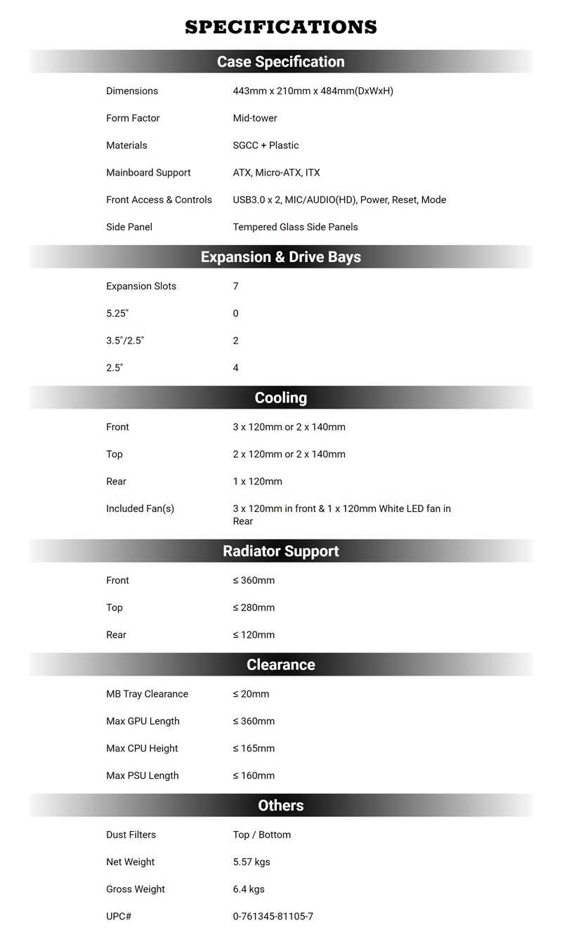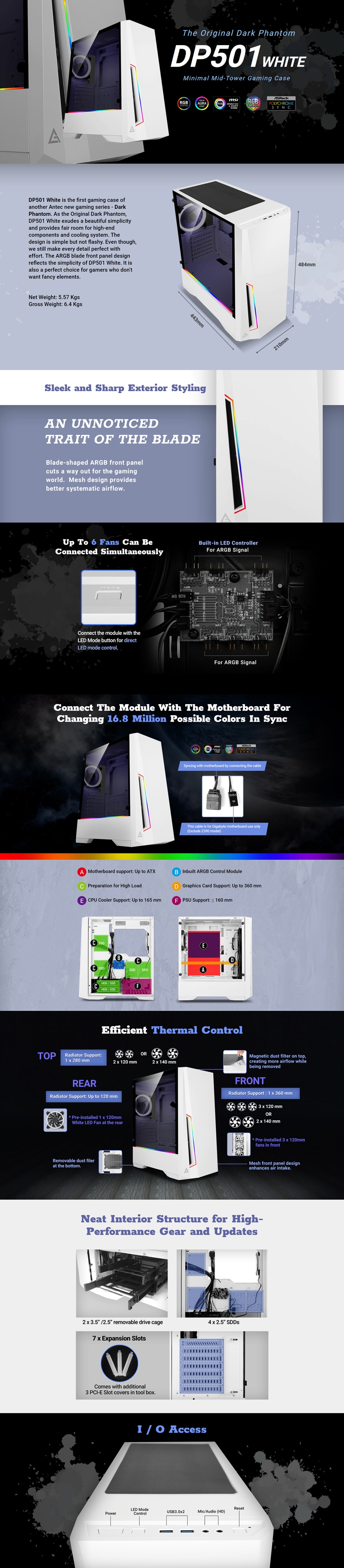 Atx Argb Front Led Led Control Tempered Glass 2.5" X 4 3.5" X 2 7X Pci.1X 120Mm Pre-Installed Gaming Case. 2 Years Warranty Dp501 White