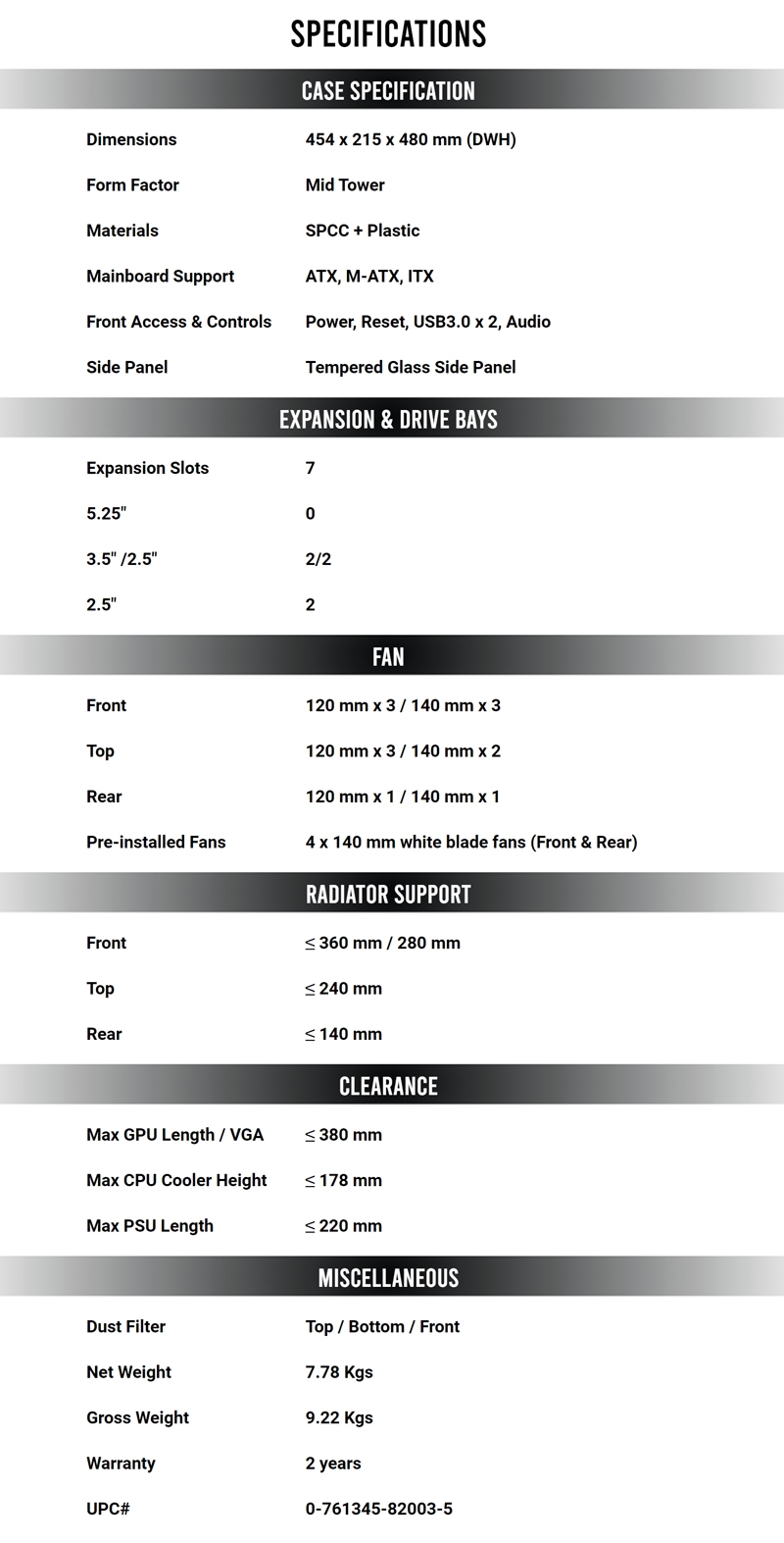 white-blade fans in the front and a 140 mm white-blade fan in the rear. It’s