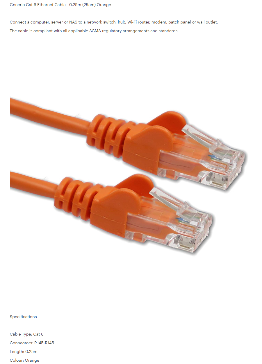 Network Cable: Cat6-A (Backward Compatible Cat6) Rj45 0.25M 25Cm Orange Cat6-0.25M Orange