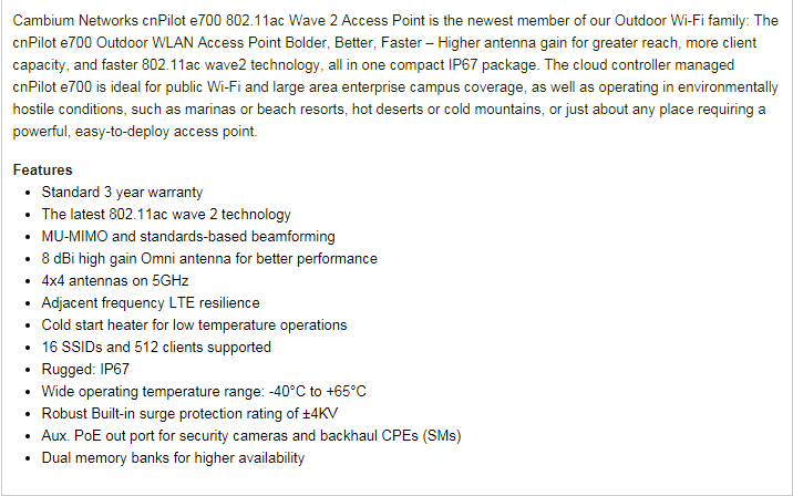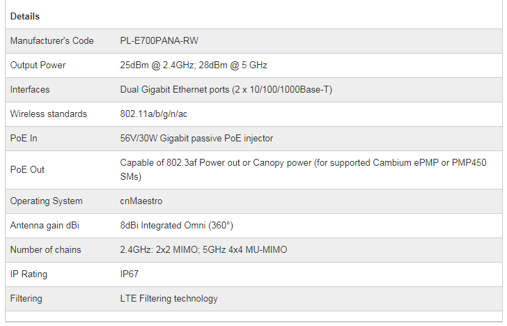 Cambium Cnpilot E700 Outdoor (Row With Aus/ Nz Cord) 802.11Ac Wave 2 2X2/ 4X4 Ap With Poe Injector Pl-E700Pana-Rw