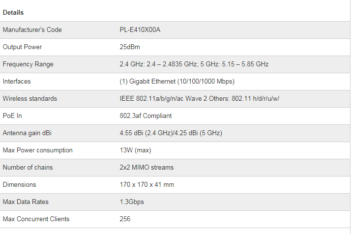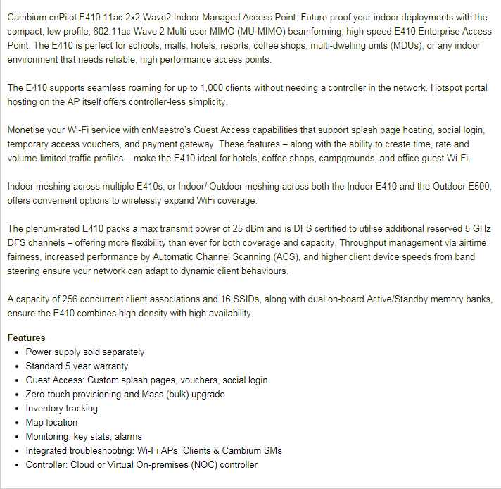 Cambium Cnpilot E410 Indoor (Row) 802.11Ac Wave 2 2X2 Ap Pl-E410X00A-Rw