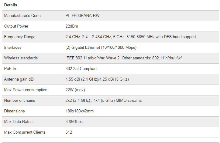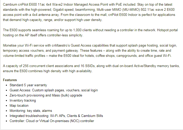 Cambium Networks - Cnpilot E600 (Row With Aus/ Nz Cord) 802.11Ac Wave 2 4X4 Ap With Poe Injector Pl-E600Pana-Rw