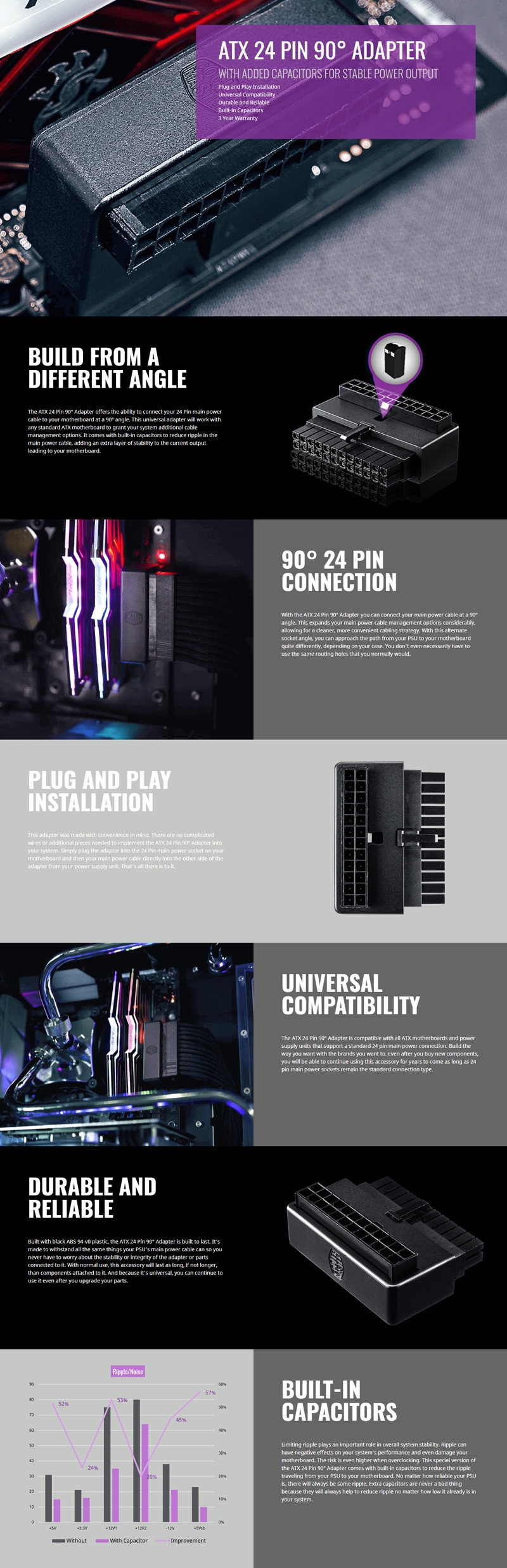 Cooler Master Atx 24 Pin 90 Degree Adapter With Capacitors Plug And Play Cma-Cemb01Xxbk1-Gl