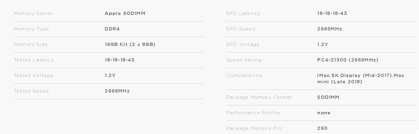 CORSAIR DDR4, 2666MHz 16GB 2x260 SODIMM 1.2V, Apple Qualified, Unbuffered, 18-18-18-43
