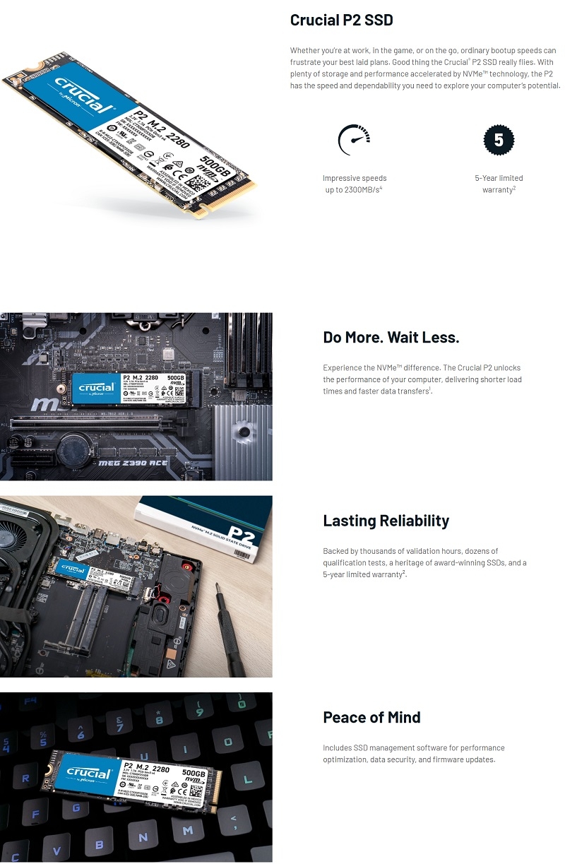 | Package Content | M.2 SSD PCIe NVMe Gen 3, Acronis® True Image™ for Crucial cloning software and installation instructions |