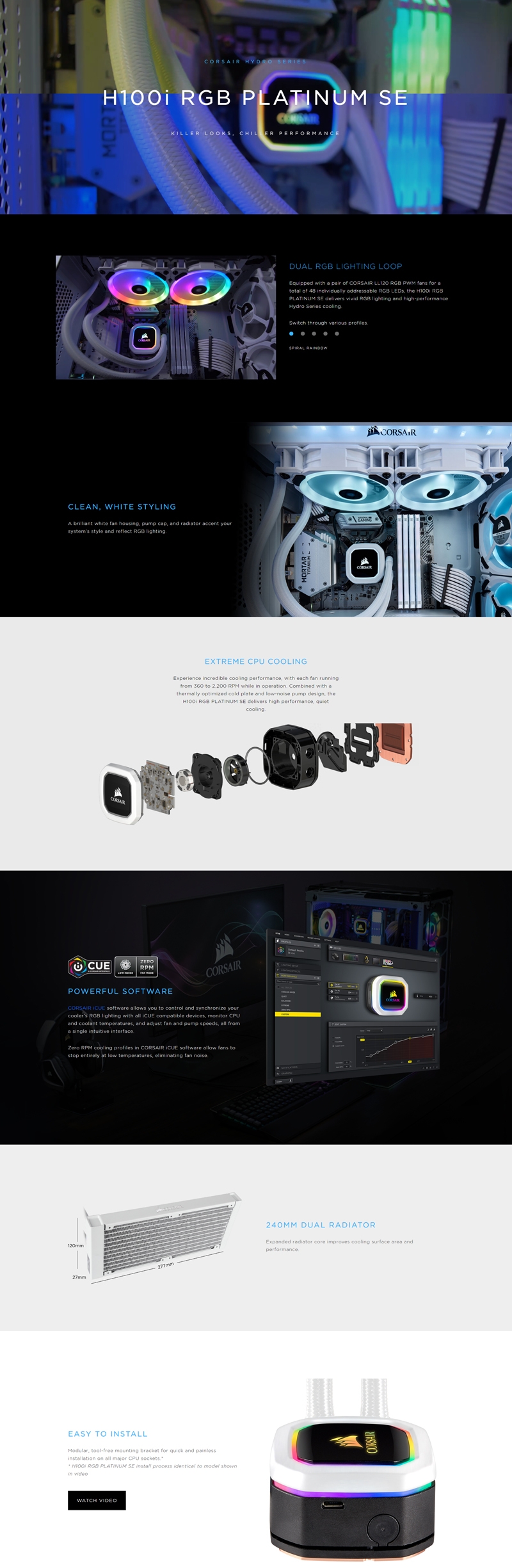 The CORSAIR Hydro Series H100i RGB PLATINUM SE is an all-in-one liquid CPU cooler with a 240mm radiator and vivid RGB lighting in brilliant white housing, built for extreme CPU cooling.