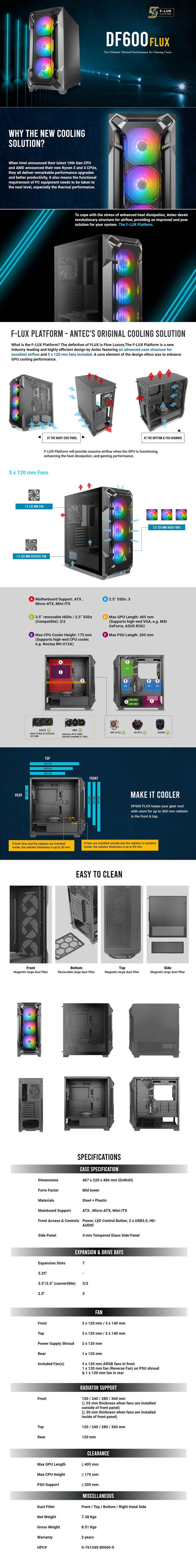 Antec Mid-Tower Case: DF600 FLUX 3x 120mm ARGB-LED Fans, 2x 120mm Fans, 2x USB 3.0, Tempered Glass Side Panel, Supports: ATX/mATX/mini-ITX (DF600 FLUX)