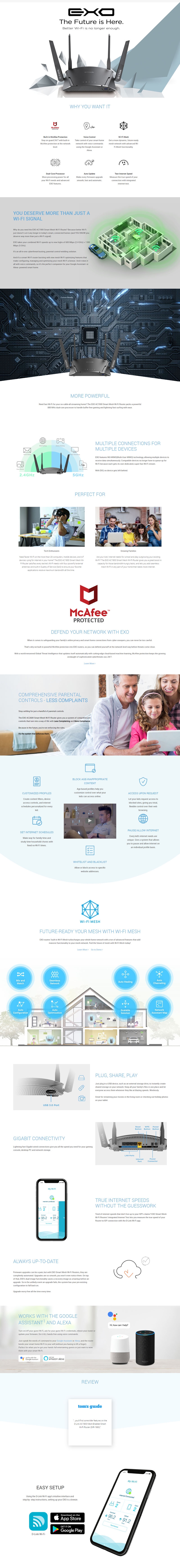 The EXO AC1900 Smart Mesh Wi-Fi Router brings hyper-fast AC1900 Wi-Fi, powerful McAfee protection, voice-based smart home Wi-Fi control and radical Wi-Fi mesh technology to your smart home. Because you know you deserve more than just a Wi-Fi signal.* Indulge in lag-free, buffer-slaying video streaming and online gaming- Hyper-fast combined Wi-Fi speeds of up to 600 Mbps (2.4 GHz) + 1300 Mbps (5 GHz)* Keep malicious threats at bay and safeguard online privacy- Built-in powerful McAfee protection for every device on your network* Works with the Google Assistant and Alexa– Give your smart home Wi-Fi a new voice* Monitor your kids’ internet activity- Comprehensive parental controls* Advanced Wi-Fi Mesh- Turbocharge your whole home network with intelligent functionality * Easily handles everything you throw at it with high-power 880 MHz dual-core processor* Test Internet speed- See how your Router-to-ISP connection measures up * Free D-Link Wi-Fi app- Set up and manage your network from your smartphone