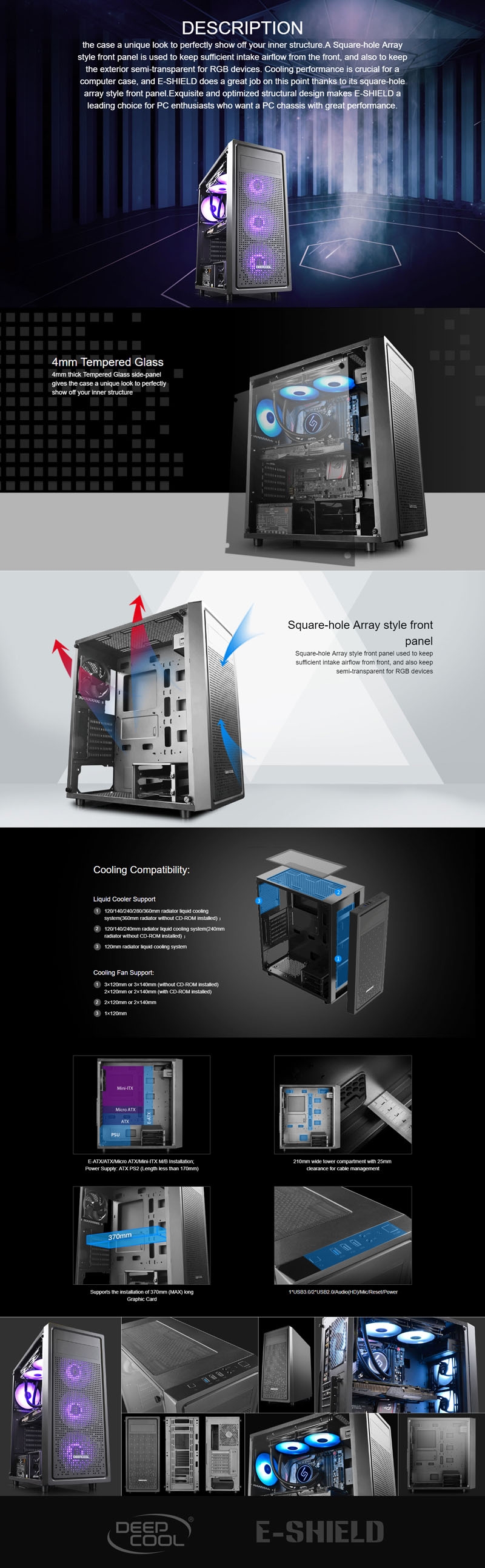Manufacturer: DeepCool. The Deepcool E-SHIELD comes with 4mm thick Tempered Glass side-panel, which gives the case a unique look to perfectly show off your inner structure. A Square-hole Array style front panel is used to keep sufficient intake airflow from the front, and also to keep the exterior semi-transparent for RGB devices. Cooling performance is crucial for a computer case, and E-SHIELD does a great job on this point thanks to its square-hole array style front panel. Exquisite and optimized structural design makes E-SHIELD a leading choice for PC enthusiasts who want a PC chassis with great performance.